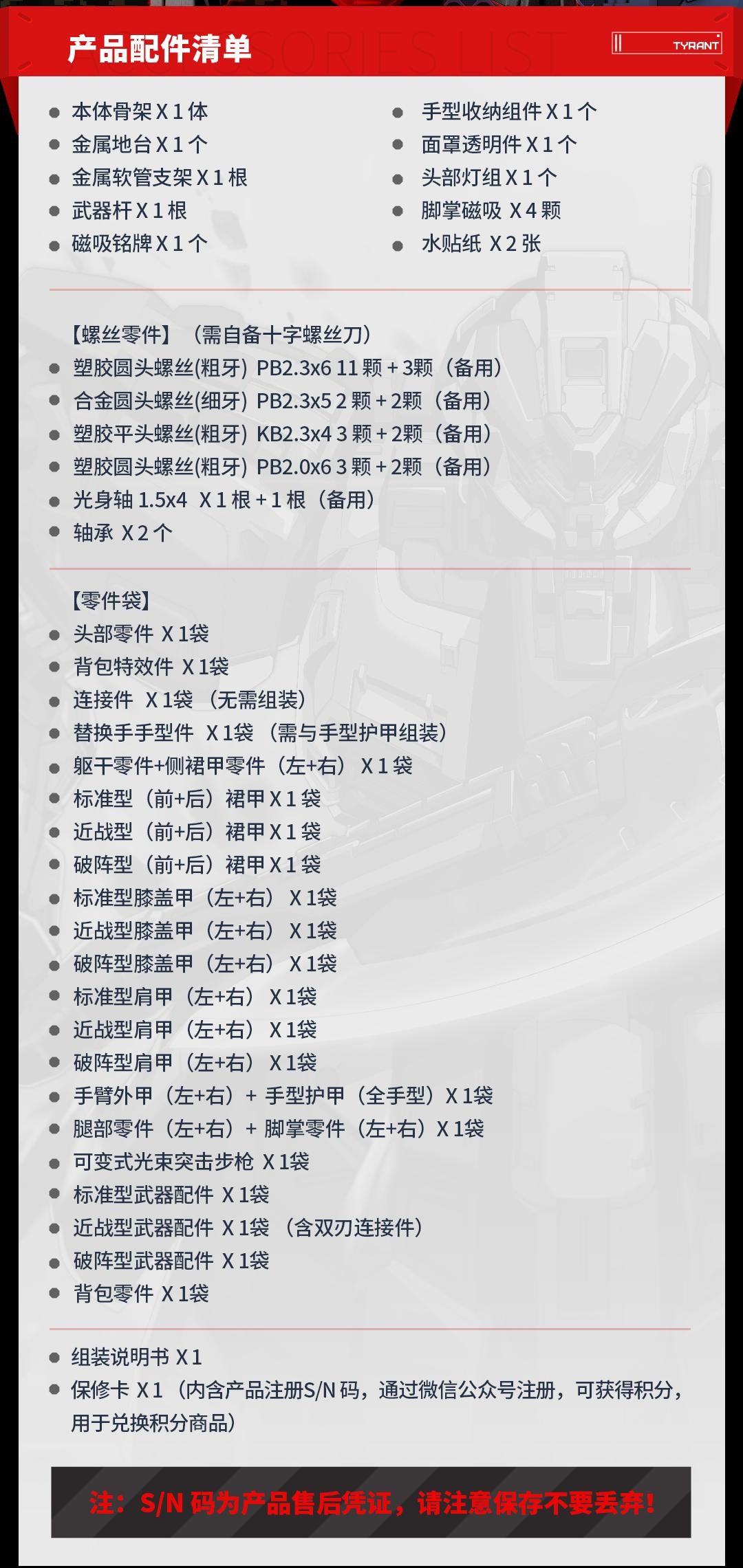 注:【卓越级·暴君·专业版】为成品未组装版本,含预组装合金骨架及未上色外甲,包含(标准型、近战型、破阵型)三款造型部件及武器配件【不含神秘礼盒内容物】,无需处理水口,开箱即可拼装;部分部位需自行使用胶水和螺丝刀完成组装;
